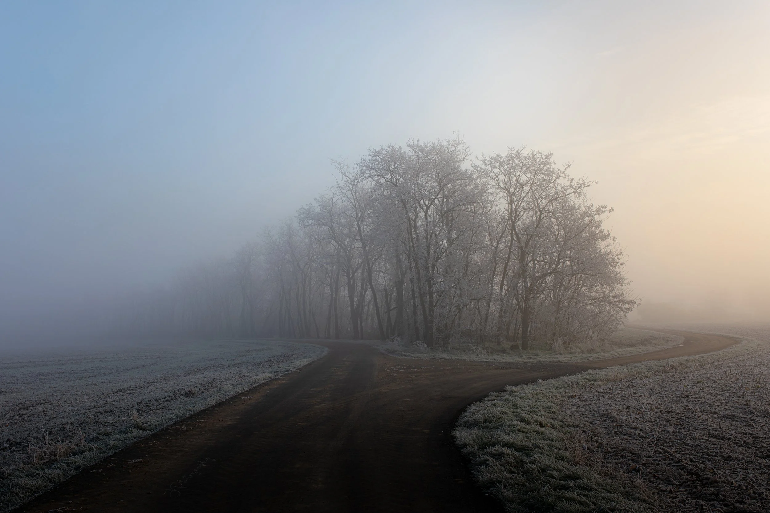 Ce matin-là, sur la route givrée qui contourne le bois, la lumière ne faisait pas ce qu'elle fait en été. Elle ne frappait pas. Elle enveloppait. Le bleu du ciel à gauche, l'orange du soleil levant à droite, le givre blanc sur les arbres du milieu — un équilibre que je n'aurais pas su inventer. Je l'ai juste trouvé, parce que j'étais là.